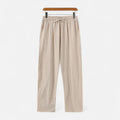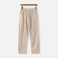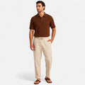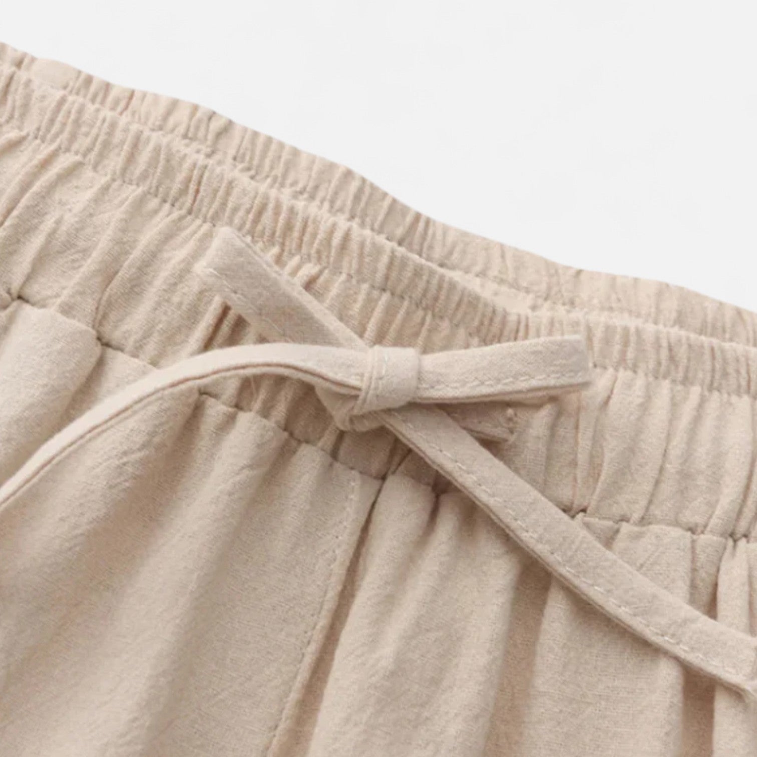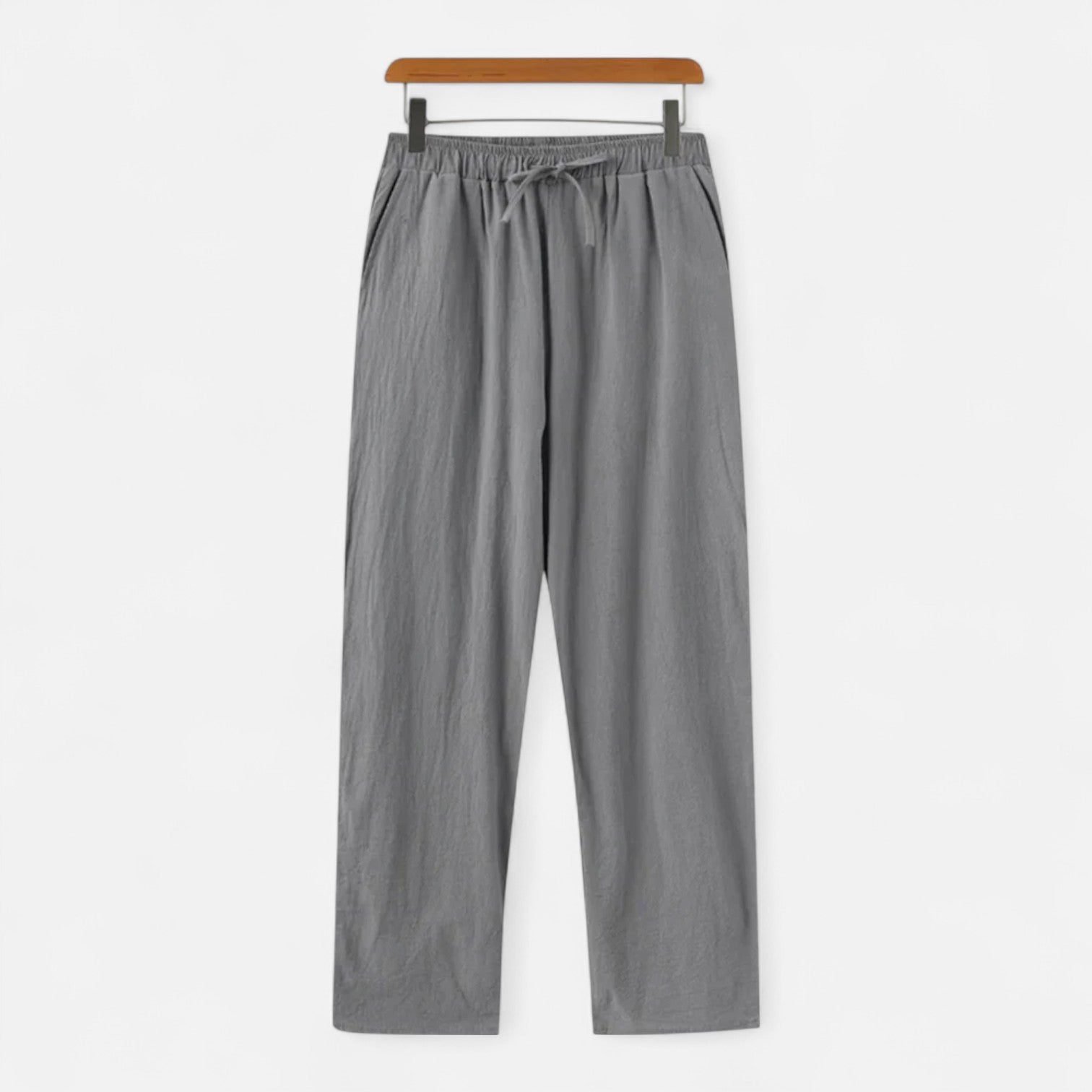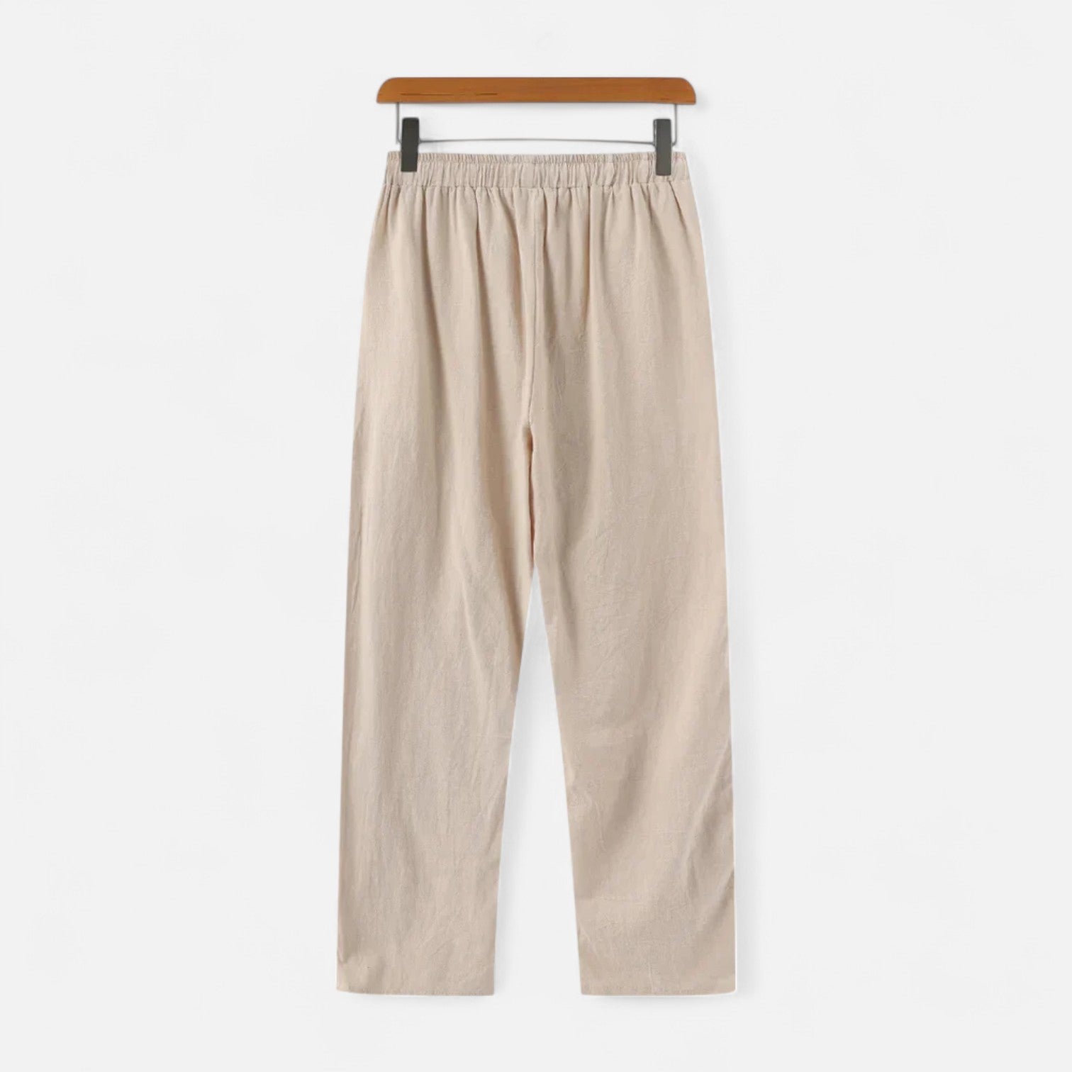 These men’s trousers are made from 100% linen. The model features a relaxed fit, an elastic waistband with drawstring, and a lightweight construction suitable for warm weather. The trousers can be combined with shirts or T-shirts for everyday use.