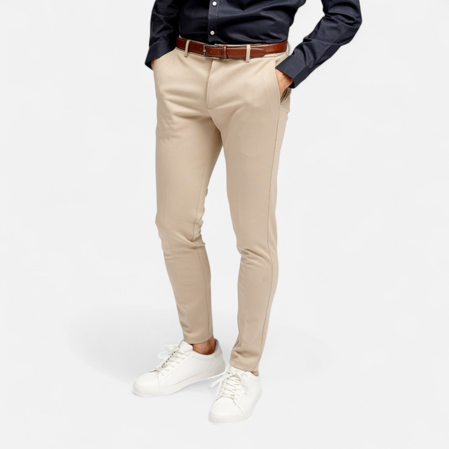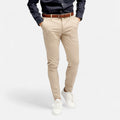 These men’s performance pants are made from a cotton blend with added stretch. The model features a slim fit with tapered legs, button and zip closure at the front, and both side and back pockets. The sand color makes them easy to combine with shirts, polo shirts, or T-shirts for work or leisure.