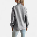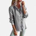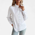 This women’s blouse is made from a silk-like, lightweight fabric. The model features long sleeves with seam details and a classic fit. The fabric is breathable and light, making the blouse suitable for work, leisure, or formal occasions.