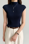 This women’s sleeveless knit top is made from a cotton blend with a slim fit and high round neckline. The model includes elastic rib knit, providing a flexible fit. The top can be worn on its own in warm months or combined with a blazer or cardigan in transitional seasons.