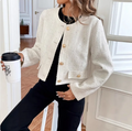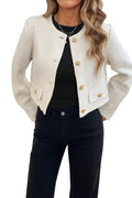 This short women’s jacket is made from a soft wool blend with a tailored fit. It features a round neckline, gold buttons, and front pockets. The jacket can be combined with dresses or trousers and is suitable for different occasions.